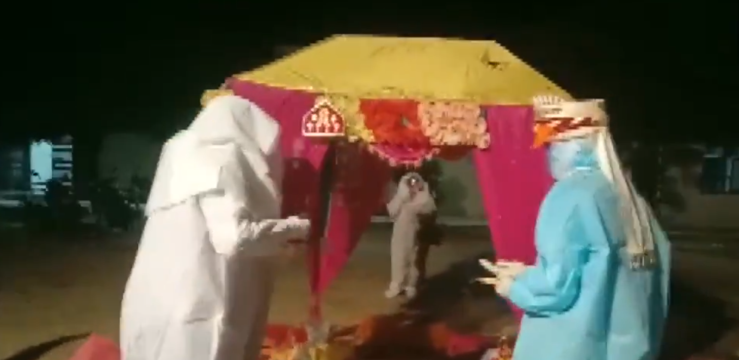 #WATCH Rajasthan: A couple gets married at Kelwara Covid Centre in Bara, Shahbad wearing PPE kits as bride's #COVID19 report came positive on the wedding day.