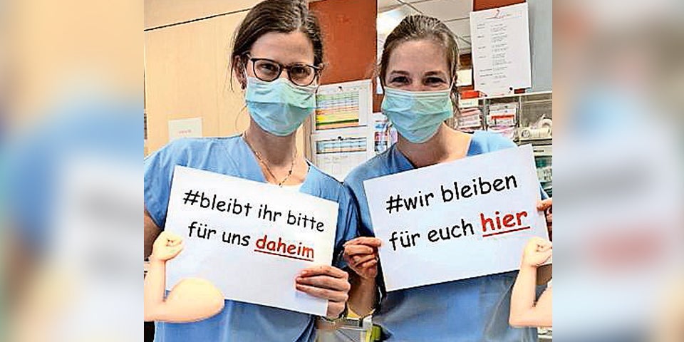 Krankenhaus. Besonders im Fokus stehen derzeit die Menschen, die in den österreichischen Krankenhäusern arbeiten: Ärzte, Krankenschwestern und Pfleger. So wie die beiden Wiener Krankenschwestern Jennifer Damith (28) und Jessica Wallner (35). Mit dem Plakat „Wir bleiben für euch da. Bleibt ihr bitte für uns daheim“ rufen sie gemeinsam mit anderen Krankenhausmitarbeitern österreichweit dazu auf, zu Hause zu bleiben. Und nur im Notfall in die Spitäler zu kommen.
