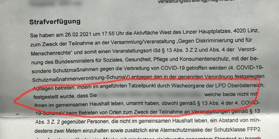 Der Vorfall ereignete sich am 26. Februar im Rahmen Demo am Linzer Hauptplatz. In der Strafverfügung heißt es, dass durch Wacheorgane der LPD Oberösterreich festgestellt wurde, dass die Frau zwei Personen, „welche beide nicht mit Ihnen im gemeinsamen Haushalt leben, umarmt habe, obwohl ein Abstand von mindestens zwei Metern einzuhalten sowie zusätzlich eine FFP2-Mase zu tragen ist“.