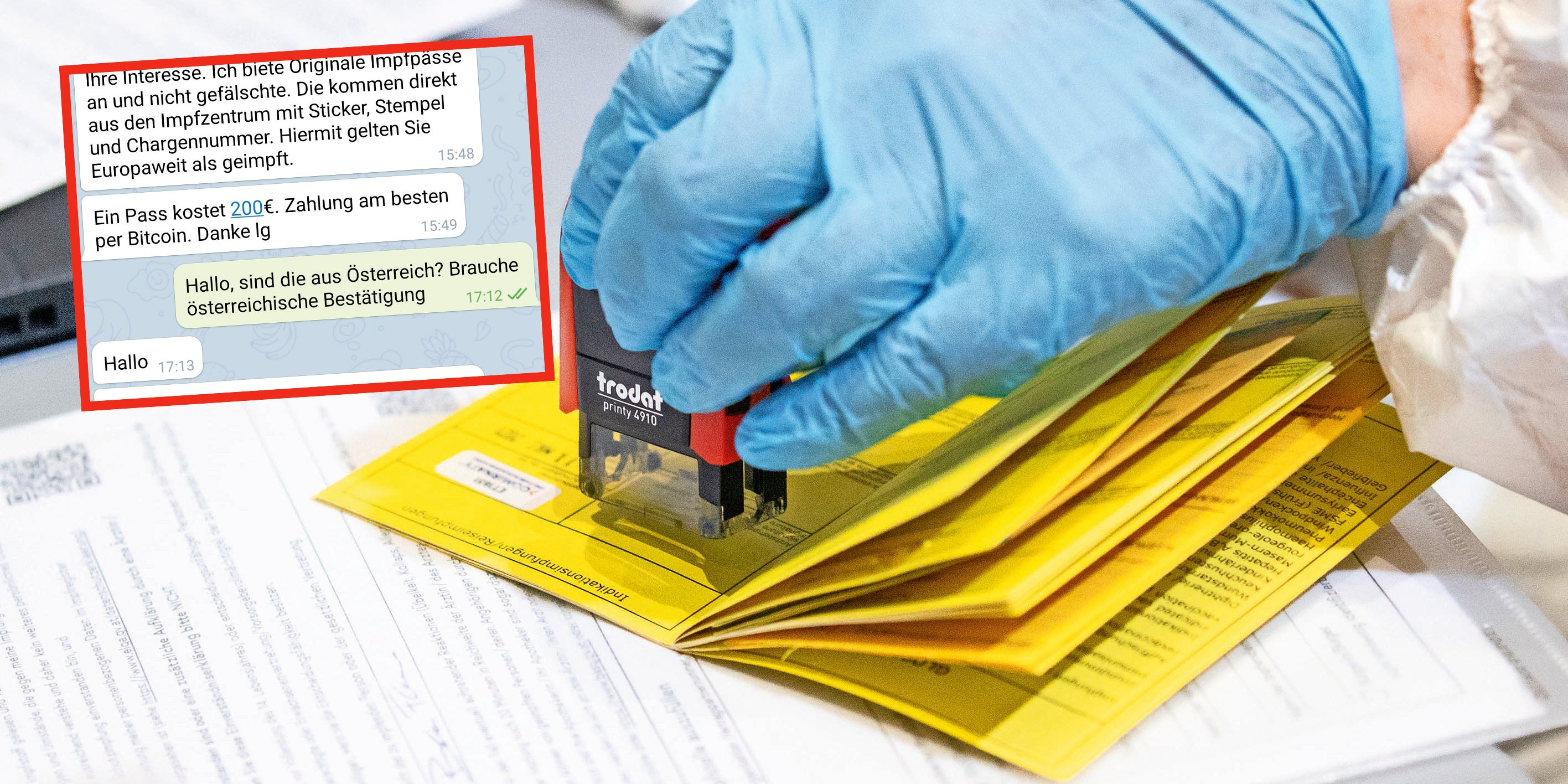 Illegaler Handel. Laut RTL läuft der Handel in Telegram-Gruppen von Corona-Leugnern ab. ÖSTERREICH nahm verdeckt Kontakt zu einem Anbieter auf. Und tatsächlich: Der Deutsche bot für 200 Euro einen gefälschen Impfpass an. Zahlung per Bitcoin oder Amazon-Gutscheine.