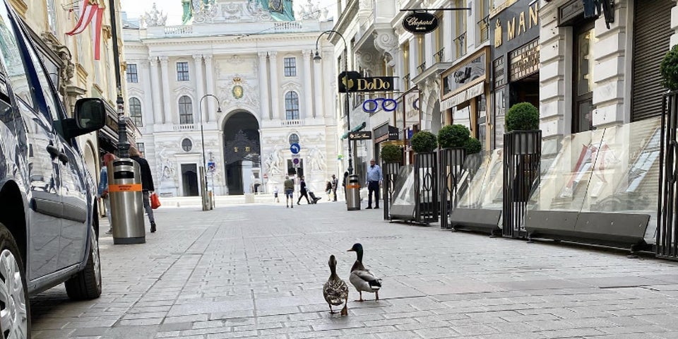 Die Lokale sind (noch) geschlossen, wenige Geschäfte haben geöffnet, die Touristen bleiben fern: Die Wiener Innenstadt ist zurzeit menschenleer. Und auch dieses Bild hat Seltenheitswert: Zwei Enten freuen sich über die Ruhe und spazieren gemütlich über den Kohlmarkt, wo sonst hunderte Wiener und Touristen strömen.