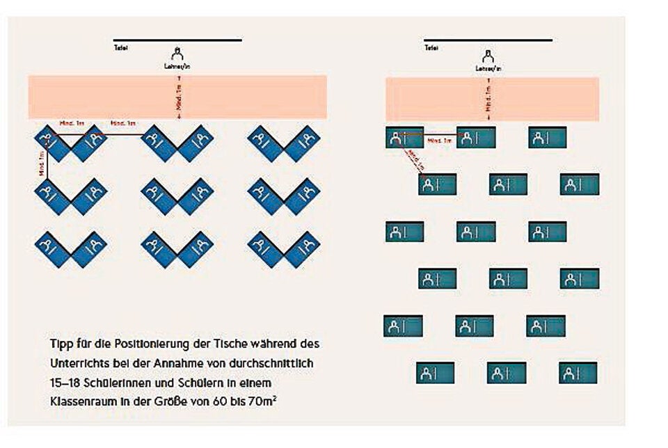 Das Ministerium liefert auch zwei Vorschläge für die Positionierung der Tische – bei 15 bis 18 Schülern auf 60 bis 70 m² – zur Einhaltung des Mindestabstands.