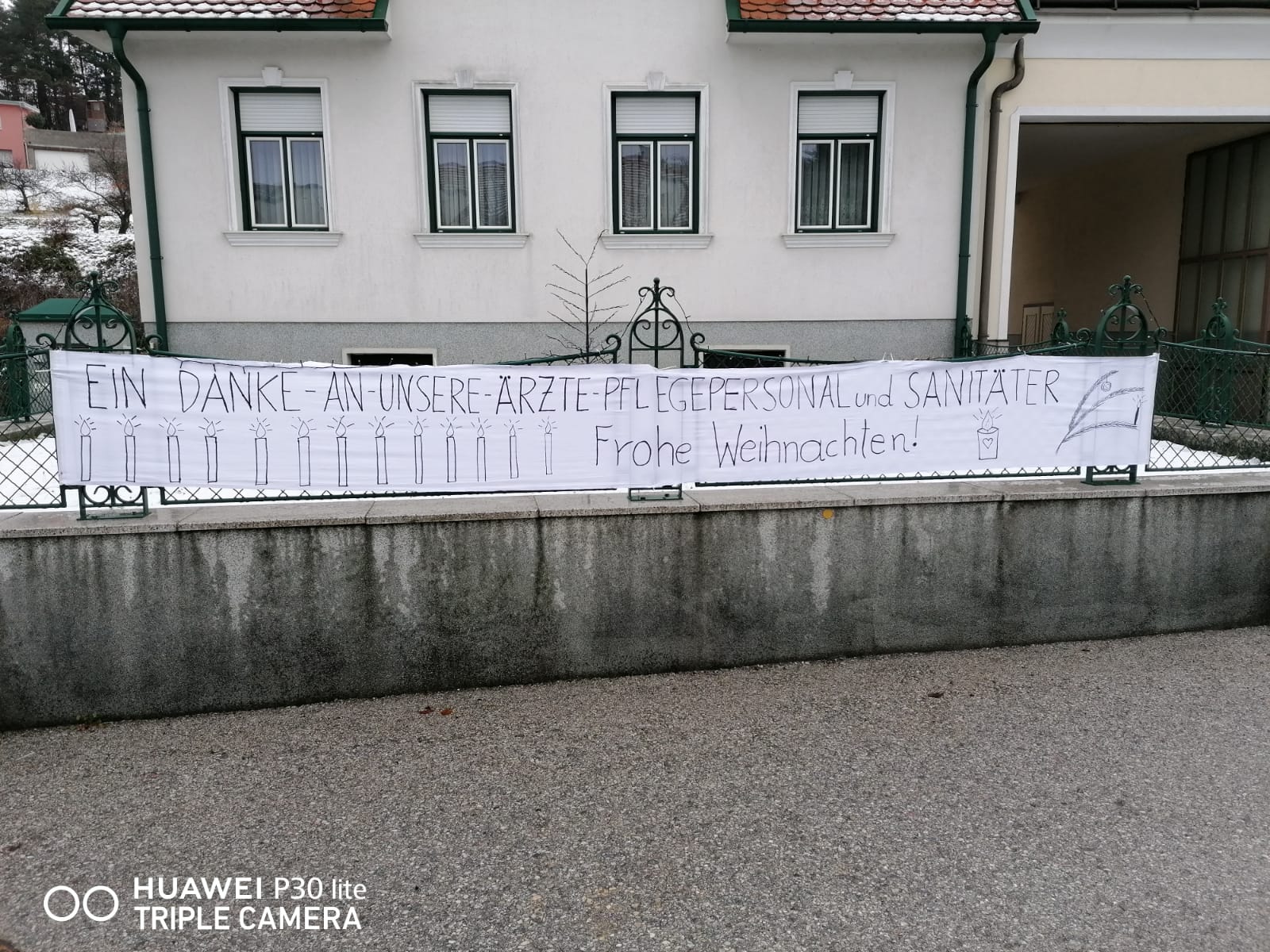Am 1. Advent bedankte sich nun eine ehemalige Pflegerin für den unermüdlichen Einsatz des Krankenhauspersonals in Form eines Banners. Eva M. aus Wiesen (Bezirk Mattersburg) ist vom Einsatz des österreichischen Pflege- und Medizinpersonal der letzten zwei Jahre so begeistert, dass sie ihre Anerkennung jetzt mit einer Geste zum Ausdruck brachte.