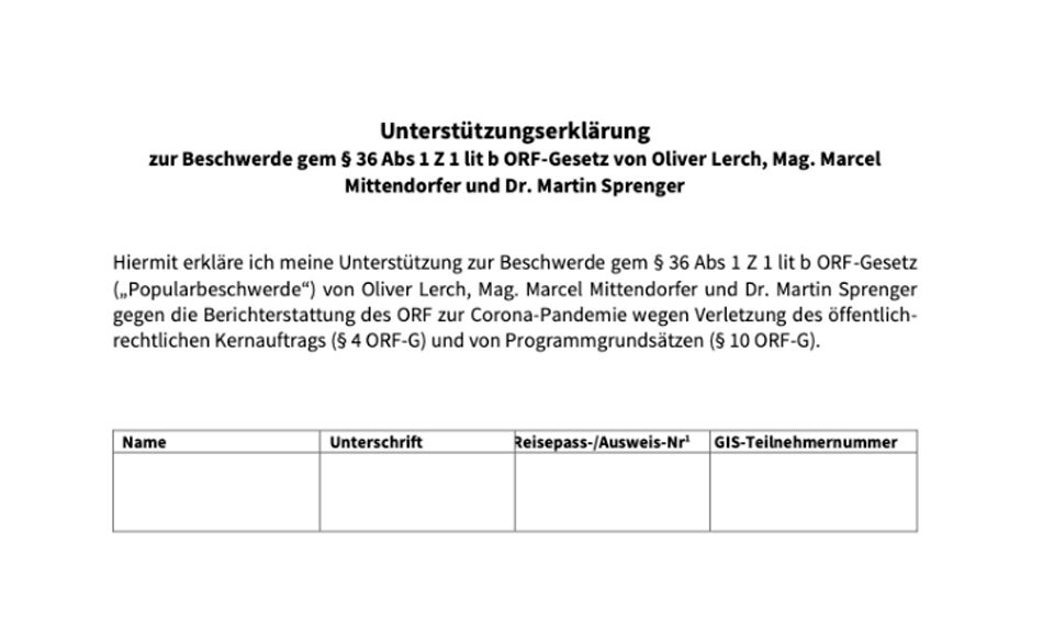 Jeder Haushalt, der GIS-Gebühr bezahlt, kann die Unterstützungserklärung unterzeichnen und bis zum 28. Jänner an kinderinderschule@olex.at mailen. „Für eine Popularbeschwerde brauchen wir gemäß ORF-Gesetz 120 Personen, die diese mit ihrem Namen unterstützen. Diese Personen müssen die Rundfunkgebühr entrichten oder aber mit einer solchen Person im gemeinsamen Haushalt leben. Bittet achtet darauf, dass leider nur 1 Unterstützungserklärung pro gebührenentrichtendem (Haushalt abgegeben werden kann“, heißt es von den Initiatoren.