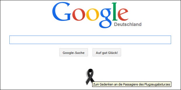 Nach der Germanwings-Katastrophe mit 150 Toten in den französischen Alpen hat die Suchmaschine Google in Deutschland und Spanien eine Trauerschleife als Symbol auf ihre Startseite genommen. Wer am Mittwoch mit der Computermaus dem schwarzen Symbol auf weißem Hintergrund unter dem Suchfeld nahekam, las die Worte "Zum Gedenken an die Passagiere des Flugzeugabsturzes" (siehe Screenshot).