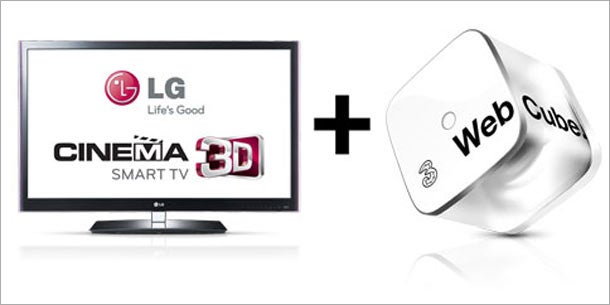 " LG LW5500 LED" (FullHD, 4 x HDMI, LED-Display) und den WLAN/3G- Router "3WebCube" um 0 Euro. Der Tarif bietet einen unbegrenzten Zugang zu Internetdiensten wie beispielsweise Facebook, Twitter, YouTube oder Google Maps, die alle am TV-Gerät via App schon vorinstalliert sind. Weiters kann man mit dem TV-Gerät via Browser auch im Internet surfen - Fernseher und WebCube müssen dazu lediglich über Knopfdruck miteinander verbunden werden.