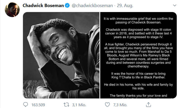 Wie berichtet, ist US-Schauspieler Chadwick Boseman, Hauptdarsteller in dem erfolgreichen Superhelden-Film "Black Panther", Ende letzter Woche überraschend gestorben