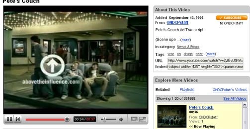 Das Weiße Haus nutzt den populären Video-Dienst YouTube für seine vom ONDCP ( Office of National Drug Control Policy ) geführte Anti-Drogenkampagne. ONDCP hatte in der Vergangenheit TV-Werbespots produziert, die nun nach und nach auch auf YouTube erscheinen sollen.