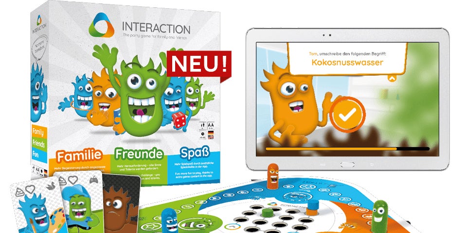 Interaction baut eine Brücke zwischen klassischem Brettspiel und digital Games. Dabei wird auf einem Brett gespielt und dieses durch eine interaktive App, kostenlos für Android und iOS, ergänzt. Dank dieser werden punktgenau die Vorlieben jedes einzelnen Spielers getroffen – was natürlich für ein Maximum an Spielspaß sorgt. Zudem lernt die App mit, wodurch sich jeder einzelne Spieler immer wieder auf neue Aufgaben und Fragen freuen darf. Darüber hinaus hat die App aber noch weitere Vorteile: So führt sie in und durch das Spiel – das Lesen einer langweiligen Spielanleitung entfällt.
