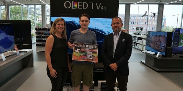 Nur einen Tag nachdem MediaMarkt seine „Rubel-Millionärin“ präsentiert hat, zieht nun Schwestermarke Saturn nach. Wie berichtet, hat der Elektronikfachhändler im Vorfeld der Fußball WM 2018 sein „Heim 11“ WM-Gewinnspiel gestartet. Nun wurde der Sieger gekürt. Michael Czimer (Mitte) darf sich über den Hauptgewinn freuen.