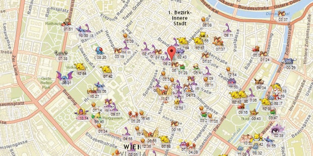 Und so funktioniert das Suchspiel im Internet. Auf der Website von „PokeVision“ einfach den gewünschten Ort eingeben, binnen weniger Sekunden wird angezeigt, wo welche Pokémon in der Umgebung dieses Ortes zu finden sind und wann sie wieder verschwinden. Die Pokémon-Karte ist für jeden problemlos nutzbar.