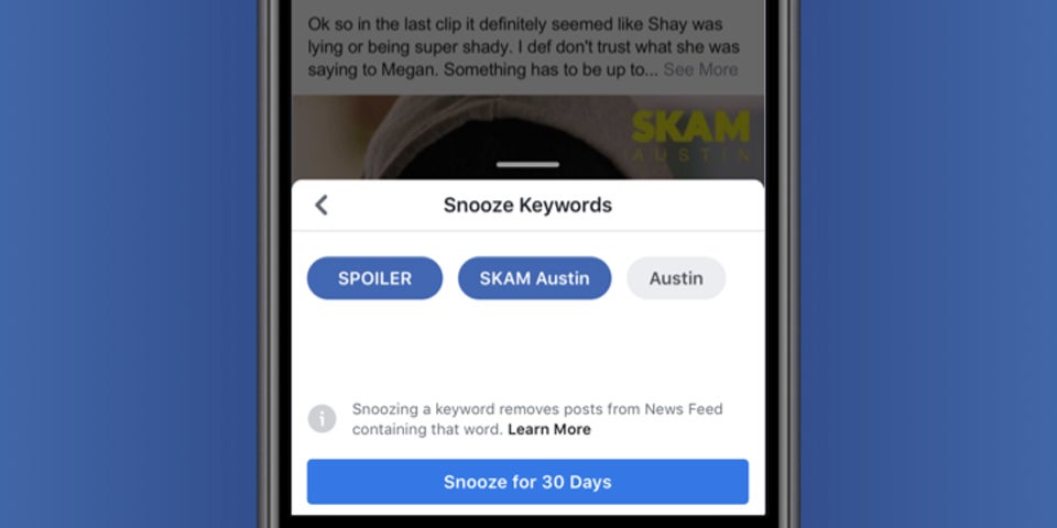 Das soziale Netzwerk hat in einem Blog-Eintrag das neue Feature „Keyword Snooze“ vorgestellt. Dieses bietet den Benutzern die Möglichkeit, Beiträge zeitweilig nach Schlüsselwörtern zu verbergen, die direkt aus dem Text in diesem Beitrag stammen. Der User kann beispielsweise „Spoiler“ und „The Big Bang Theory“ als (Filter-)Keywords eingeben. Wer „Snooze“ aktiviert, bekommt in seinem Newsfeed dann 30 Tage lang keine Beiträge - die genau die Wörter oder Phrasen enthalten - von Personen, Seiten oder Gruppen angezeigt. „Mit anderen Worten, weniger Spoiler“, verspricht Facebook in der Ankündigung. Änderbar ist dieser Zeitraum (vorerst) nicht.