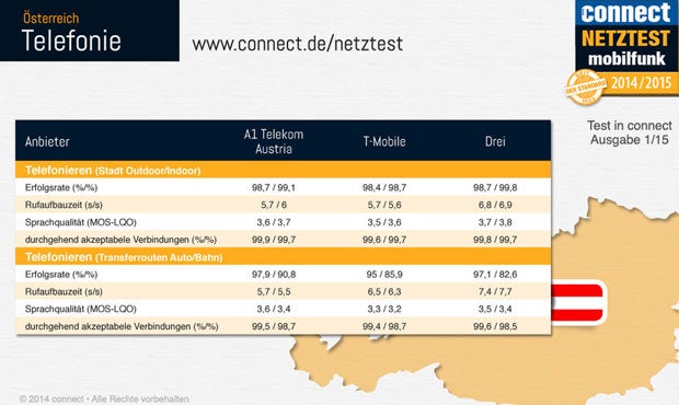 Von den vier Telefonie- und fünf Datenkategorien entscheidet A1 immerhin acht für sich. Laut den Testern von Connect ist das vor allem der stabilen und klangstarken Sprachübertragung zu verdanken - und dem nahezu flächendeckenden, extrem schnellen Datennetz. Doch T-Mobile und " 3 " bleiben dem Primus auf den Fersen und erzielen im härteren Netztest gute Resultate.