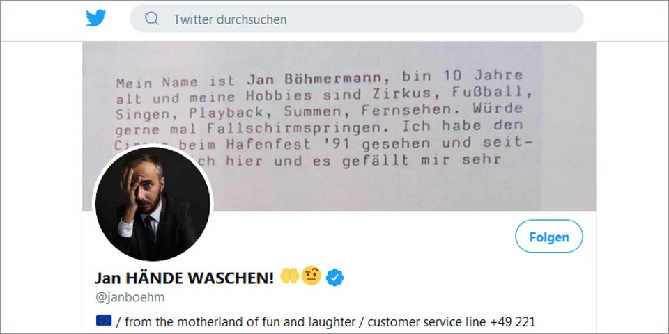 Jan Böhmermann (39) nennt sich in der Corona-Krise bei Twitter jetzt "Jan HÄNDE WASCHEN" und fordert Hilfe für die Kulturszene. "Kulturstätten, Künstlerinnen, Künstler, Autorinnen, Autoren, Theater, Kinos oder Veranstalter werden in den kommenden Monaten unsere Solidarität und wirtschaftliche Unterstützung benötigen", twitterte er.