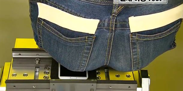 Geschenkt wird den Smartphones jedenfalls nichts. Allein der mechanische Button wird bei dem gezeigten Gerät 200.000 Mal betätigt. Für diese Tests kommen diverse Spezial-Maschinen zum Einsatz. Am kuriosesten ist dabei der "künstliche Hintern", der sogar in einer Jeans steckt. Mit diesem simulieren die Tester, das Draufsetzen aufs Smartphone, wenn dieses auf einem Stuhl, einer Bank, etc. liegt. Die Kratzfestigkeit überprüft ein Mischtest, bei dem das Smartphone mit Steinen und Wasser in eine Trommel gesteckt und ordentlich durchgemischt wird. Darüber hinaus wird auch die Wasserfestigkeit getestet. Hierbei wird das Gerät mit einem Schlauch abgespritzt. Erst wenn das neue Smartphone all diese Ansprüche erfüllt, kommt es in den Handel.