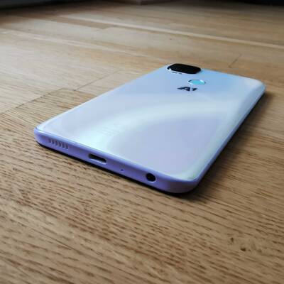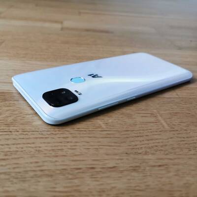 Optisch ist das Alpha 20+ ansprechend designt. Das 6,53-Zoll große Display verfügt über ein kleines Loch für die Frontkamera und einen schlanken Rahmen. Mit seinem abgerundetem Design und der hellen Farbe sieht es stylisch aus und liegt gut in der Hand. Trotz Plastikgehäuse greift sich das Smartphone angenehm an und ist hochwertig verarbeitet. Vorder- und Rückseite des 162.7 x 76.3 x 8.6 mm großen und 185 Gramm schweren Handys werden per Aluminumrahmen miteinander verbunden. Auf der Rückseite finden sich das A1-Branding, der zuverlässig funktionierende Fingerabdrucksensor und die Hauptkamera. Letztere liegt mit seiner Quadrat-Optik voll im Trend. Das Modul ragt nur leicht aus dem Gehäuse heraus. Deshalb wackelt das Alpha 20+ auch nicht, wenn es beim Tippen auf einem flachen Untergrund liegt. Wer das Hervorstehen unterbinden will, kann zu einer passenden Schutzhülle greifen, die A1 als Extra anbietet. Besonders positiv ist uns die normale Kopfhörerbuchse (3,5mm-Klinke) aufgefallen, die bei vielen teuren Top-Smartphones nicht mehr mit an Bord ist. Eine IP-Zertifizierung gibt es leider nicht.