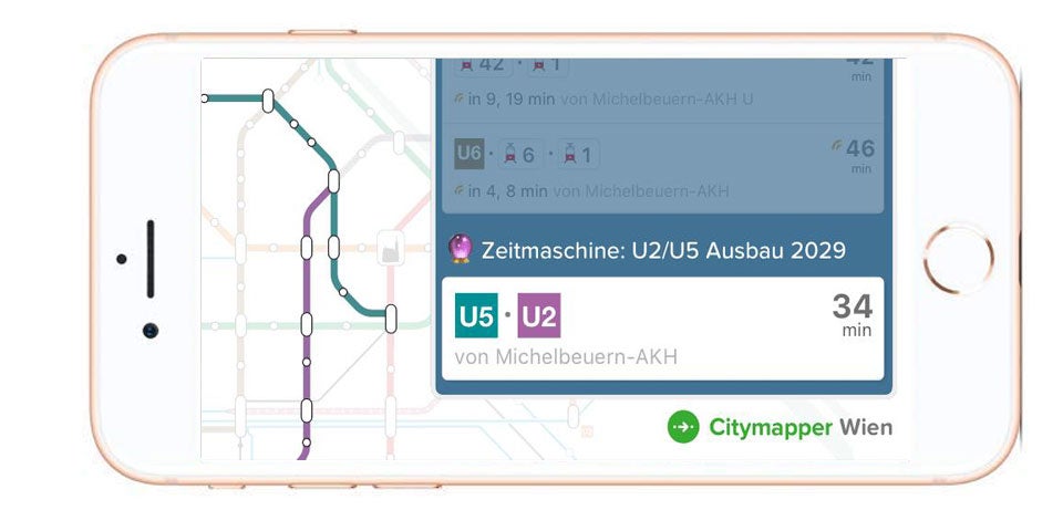 Konkret wird die App ab sofort zu einer Art Zeitmaschine. Mit der neuen Funktion kommen nämlich die beiden neuen U-Bahn-Linien U2 und U5, die gerade gebaut werden und erst in einigen Jahren in Betrieb gehen, zum Vorschein. Citymapper-Nutzer sehen bei ihrer Routenplanung damit schon jetzt, welche neuen Wege sich durch die U2 und U5 für sie künftig ergeben. Besonders praktisch: Es wird auch die jeweilige Fahrzeit angezeigt. So sieht man, wie viel Zeit man sich gegenüber der aktuelle Route erspart.