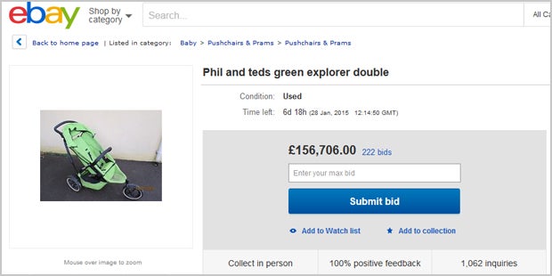 Über die Farbe (knallgrün) lässt sich streiten, auch ist ihm anzusehen, dass er schon deutlich bessere Zeiten gesehen hat, dennoch könnte ein Kinderwagen einen dreifachen Familienvater aus England jetzt reich machen. Denn der frustrierte "UKJoel25" hat den Buggy auf Ebay gestellt, wo ein Mega-Hype um die Anzeige losging. Derzeit gibt es 221 Gebote, das höchste liegt bei sagenhaften 156.505 Pfund (umgerechnet mehr als 200.000 Euro).