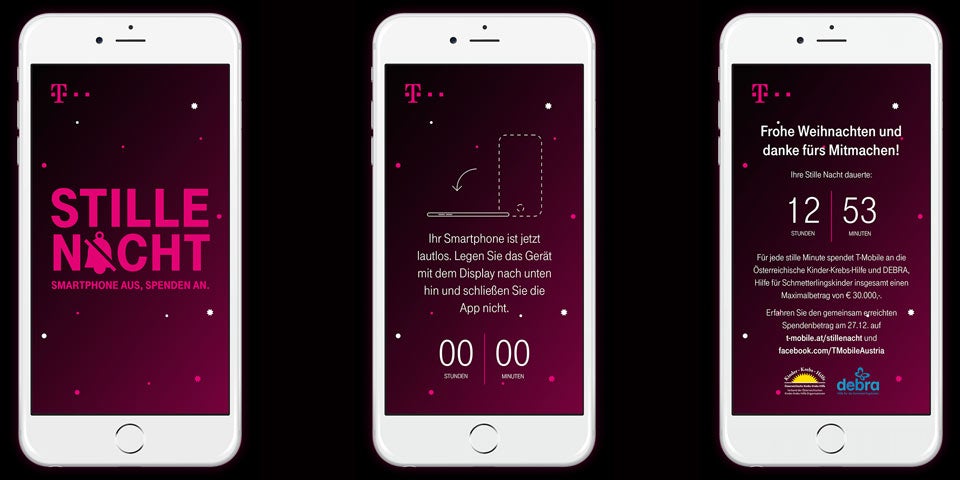 Nach dem großen Erfolg des Vorjahres ruft T-Mobile auch heuer zum "Digitalen Detox" an Heilig Abend für den guten Zweck auf. Zu Weihnachten 2016 wurden von österreichischen Smartphone-Nutzern mittels App 14 Millionen „stille Minuten“ gesammelt, indem diese das Smartphone in den Lautlos-Modus geschaltet haben. Ab sofort steht auch für den 24. Dezember 2017 wieder die „Stille Nacht“-App zum Download bereit, die am Weihnachtstag lautlose Minuten zählt.