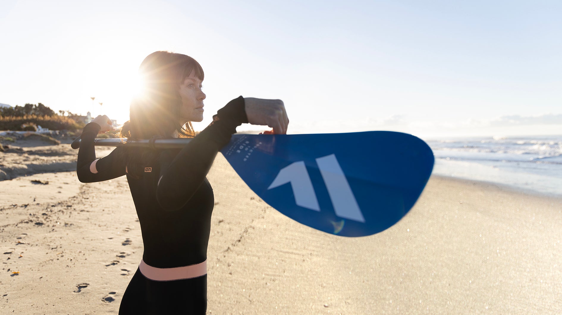Aufstehen: Füße schulterbreit, Knie leicht gebeugt. Mit einem Arm das Griffende des Paddels greifen. Der andere greift etwa schulterbreit an den Holm. Der obere Arm (Druckarm) drückt, der untere zieht.