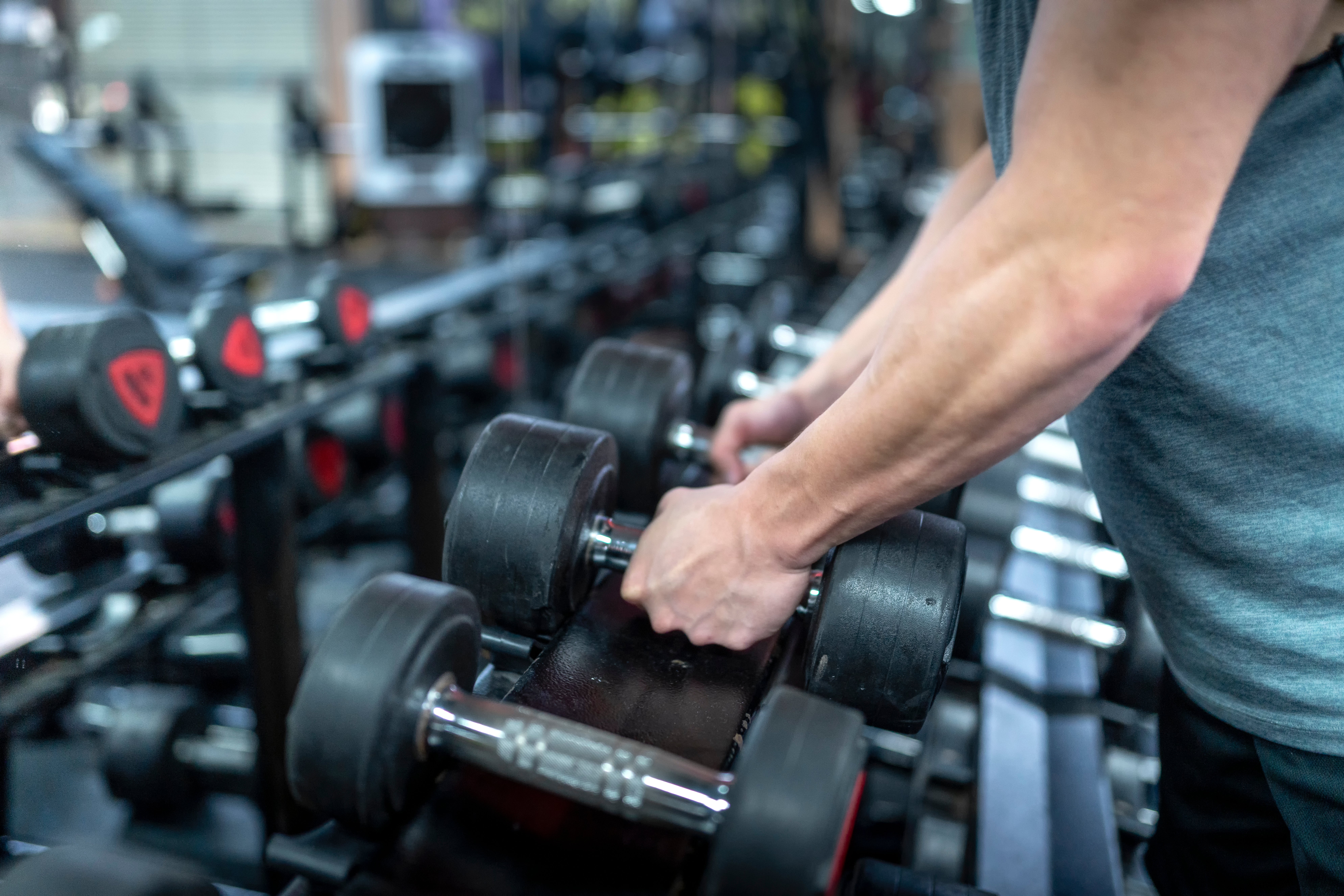 Wer möchte, kann auch beim Hanteltraining spezielle Fitnesshandschuhe tragen, um den direkten Kontakt mit den Oberflächen zu vermeiden.
