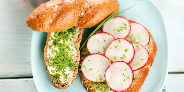 Zubereitung: Die Brotscheiben mit Butter bestreichen und mit frisch geschnittenem Schnittlauch bestreuen. Die Radieschen in Scheiben schneiden und darauf verteilen.