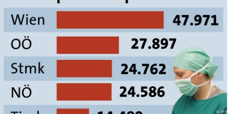 "Spitalszentrum" ist wenig überraschend Wien, wo gut 70.000 Jobs direkt oder indirekt an den Spitälern hängen. In Oberösterreich sind es über 40.000, in Niederösterreich und der Steiermark gut 36.000. Dahinter folgen Tirol (21.200), Kärnten (16.700), Salzburg (13.500), Vorarlberg (8.000) und das Burgenland (5.200).