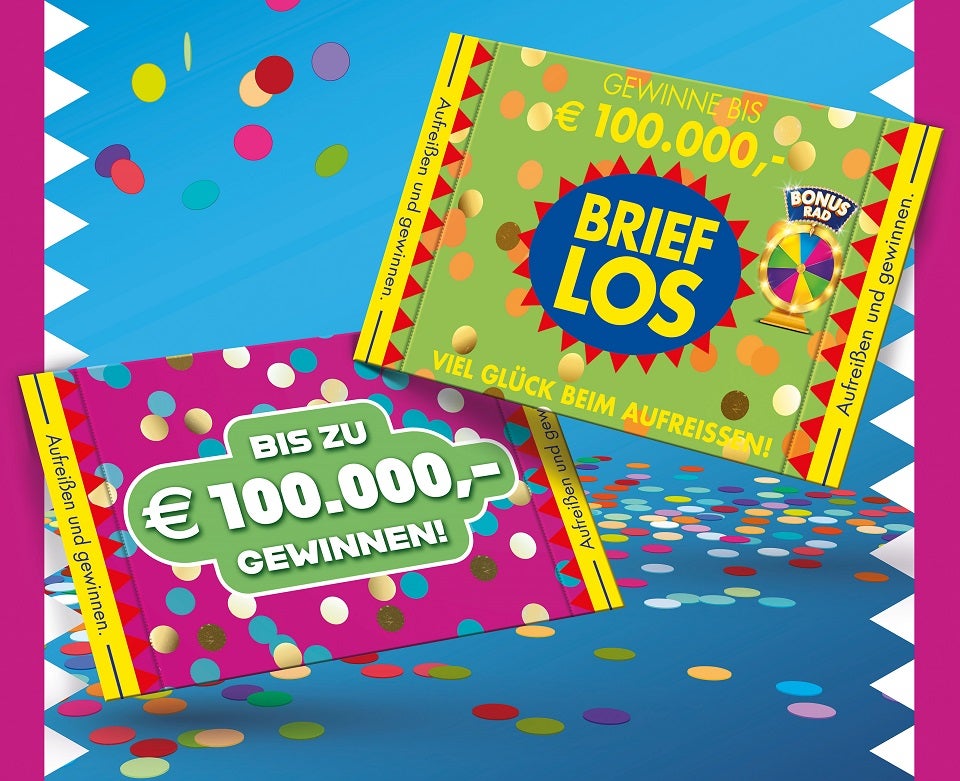 Beim neuen Brieflos gibt es für alle Personen ab 18 Jahren die Chance auf einen „Konfetti-Regen“ mit bis zu 100.000 Euro als Hauptgewinn und viele weitere Gewinne zwischen 1 und 10.000 Euro sowie das BONUSRAD. Und das bei einem Lospreis von nur 1 Euro.