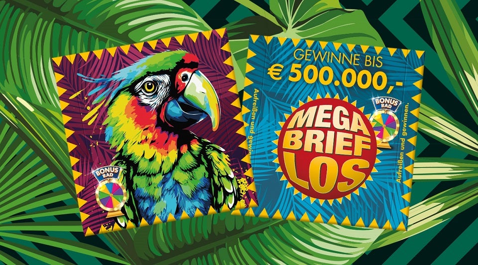 Der Papagei ziert ab sofort die Vorderseite des neuen Mega Briefloses, bei dem der Hauptgewinn – wie auch bei allen bisherigen Mega Brieflosen – wiederum 500.000 Euro beträgt. Daneben gibt es zahlreiche weitere Gewinne von 3 bis 1.000 Euro, und das alles bei einem Lospreis von 3 Euro. Die Losserie besteht aus 2,5 Millionen Losen, und es gibt vier unterschiedliche Farbvarianten: lila, blau, gelb und grün.
