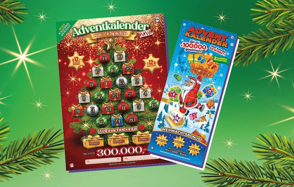 Und dann gibt es dieses Jahr erneut einen weiteren Kalender mit dem Motto Advent: den Rubbellos Adventkalender XXL mit 24 Spielen. Das heißt: Jedes Türchen ist ein Spielchen mit einer eigenen Gewinnchance. Der Hauptgewinn beträgt 300.000 Euro.