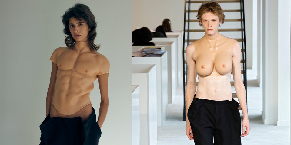 Noch mal von Anfang an: Ein Designer - namens Duran Lantink - entwarf bestimmte "Kleidungsstücke", die man sich drüberziehen kann. Er schickte seine Männer-Models auf den Laufsteg, die Fake-Brüste trugen. Oder auch Frauenmodels, die einen männlichen, durchtrainierten Oberkörper trugen. Kein Scherz! Überzeugen Sie sich selbst: