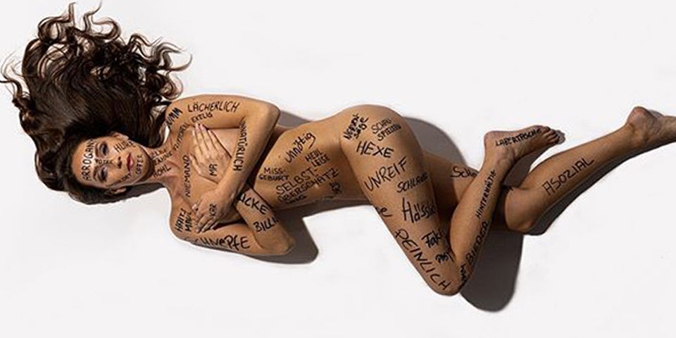 Auf dem Körper der 31-Jährigen sind diverse Beschimpfungen zu lesen, sehr unschöne Worte. Die Aktion erinnert an eine, die Lena Meyer-Landrut initiiert hat. Auch sie schrieb Hassworte auf ihren nackten Körper.