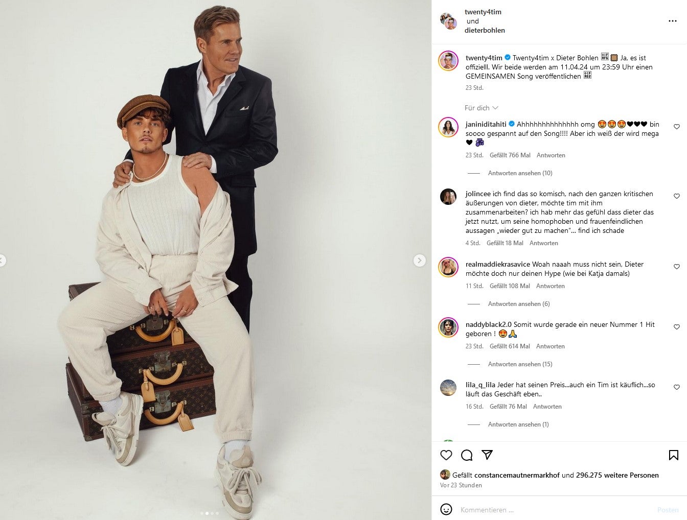 Nicht alle Fans freut das. "Jeder hat seinen Preis...auch ein Tim ist käuflich...so läuft das Geschäft" und "Ich finde das komisch, nach den ganzen kritischen Äußerungen von Dieter, möchte Tim mit ihm zusammenarbeiten?", "Bohlen ist homophob und frauenfeindlich" und "er steht null hinter dir und dem, was du machst", lauten nur ein paar der unzähligen kritischen Kommentare.