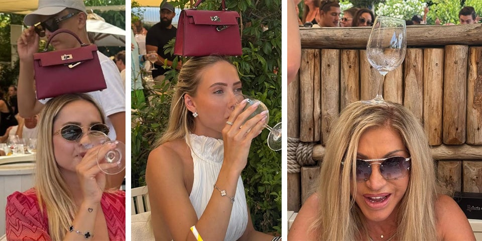 Auf den Bildern sind sie beim Champagner schlürfen zu sehen. Doch nur trinken ist ihnen scheinbar zu fad. Darum wird eine kleine Hermes-Tasche auf den Köpfen platziert, als kleines Trinkspiel.