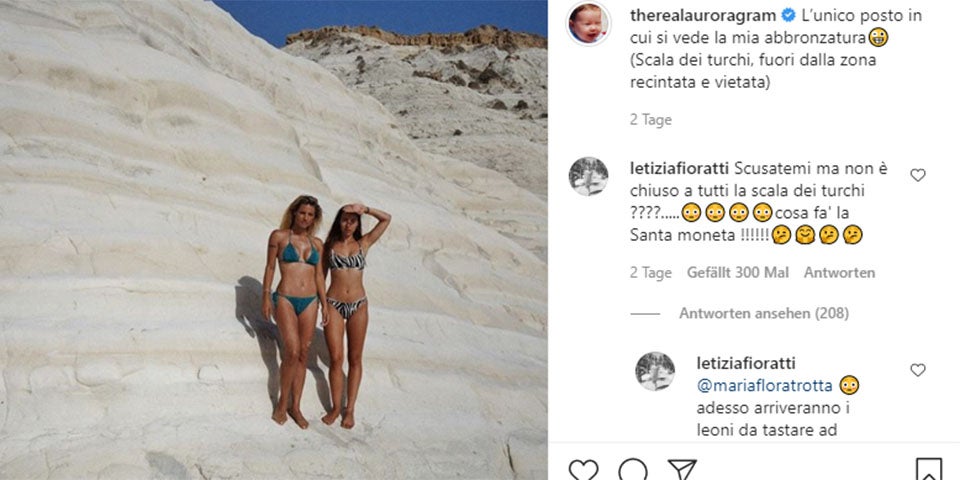 Gerne lässt die 43-jährige Moderatorin ihre Follower an privaten Momenten teilhaben. Doch bei einem Bild, das sowohl sie als auch Tochter Aurora auf Instagram gepostet hat, gibt es nun Kritik statt Likes. Aber warum nur? Auf den ersten Blick ist daran nichts komisches zu erkennen. Mama und Tochter sitzen oder stehen im Bikini nebeneinander und plaudern. Ein fescher Anblick! Doch der Hintergrund ist das Problem. Die zwei Frauen posieren nämlich auf einer Felswand, der "Scala dei Turchi". Und just diese Touristenattraktion ist derzeit gesperrt! Aus Sicherheitsgründen, wie es heißt, denn die Felswand ist glatt und darum das Risiko hoch, darauf auszurutschen.