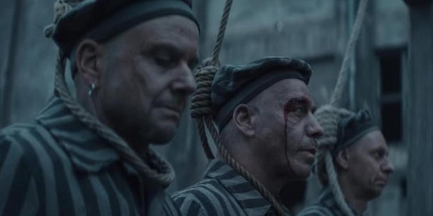 Die Kamera geht langsam an den Gesichtern der vier Musiker am Galgen vorbei. Sie starren in KZ-Häftlings-ähnlicher Kleidung nach vorne - mit dem Strick um den Hals. Sänger Till Lindemann (56) blutet aus einer Wunde über dem rechten Auge.