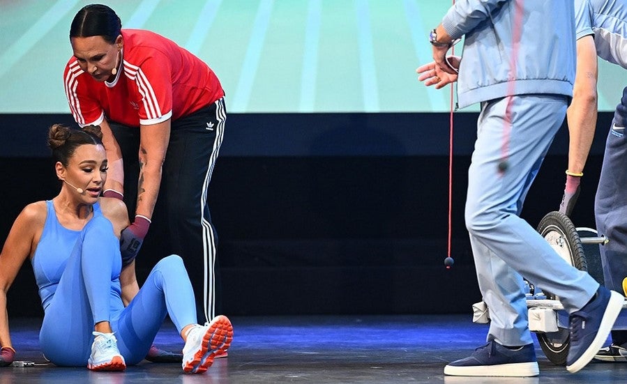Die Moderatorin sorgte für große Aufregung. Gleich im ersten Spiel stürzte sie und musste verarztet werden.