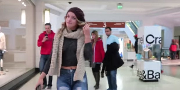 Maria Luciotti ist ein Model aus dem US-Bundesstaat Maryland. Für ein Experiment lief die hübsche Blondine durch ein Einkaufszentrum in Towson. Dabei trägt sie schwarze Stiefel, eine rote Mütze, einen Pullover und Ripped Jeans. Was auf den ersten Blick ganz normal wirkt, ist in Wahrheit aber ganz anders.