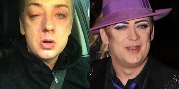 Der Sänger Boy George ist bekannt für seinen violetten Hut und sein eher ausgefallenes Make-up in der Augen-Gegend. Wegen der Kopfbedeckung hat er nun einen permanenten Anstrich in Form eines blauen Auges kassiert.