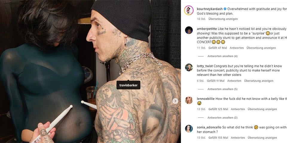 Der Reality-Star hat sich etwas ganz besonderes einfallen lassen, um ihre Fans am Glück teilhaben zu lassen. Sie kam zu einem Konzert der Band und hielt ein Schild in die Luft. Auf dem war zu lesen: "Travis, ich bin schwanger!" Doch nicht alles freuten sich über diese Ankündigung. Auf Instagram ging es rund, weil viele meinten, der Babybauch sei schon so groß, dass er nicht zu übersehen ist. Dem Paar wird vorgeworfen, nur eine Show abzuziehen.