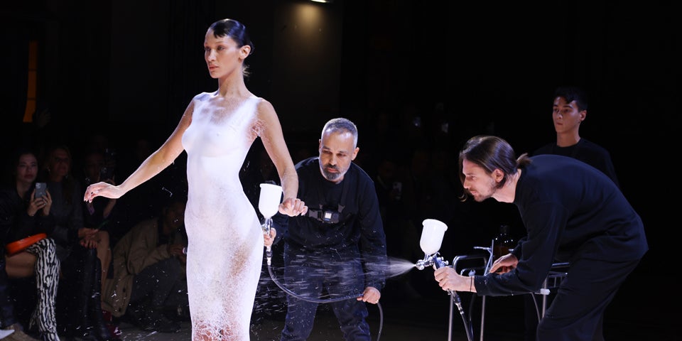 For spring 2023, #Coperni dedicated its runway to “women of this world.” The main event? @bellahadid taking front and center stage while three men spray-painted a dress onto her body. pic.twitter.com/Ligcmgk4xz