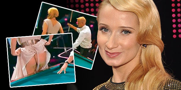 Karina war Teil einer Billard-Show und musste sich dafür auf den Tisch legen. Beim Erklimmen lüpfte sie ihr – ohnehin stark geschlitztes Kleid – und zeigte dem heimischen TV-Publikum – ungewollt – ihre sexy Kehrseite.