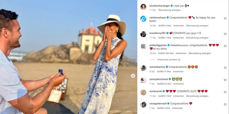 Die britische Sängerin Nicole Scherzinger hat sich verlobt. Auf einem Foto, das die 44-Jährige in der Nacht auf Mittwoch auf ihrem Instagram-Account veröffentlichte, kniet ihr Freund Thom Evans (38) an einem Strand vor ihr und streckt ihr einen Ring entgegen. "Ich habe Ja gesagt", schrieb das Mitglied der Girlband Pussycat Dolls und fügte als Emojis einen Ring und ein Herz hinzu.