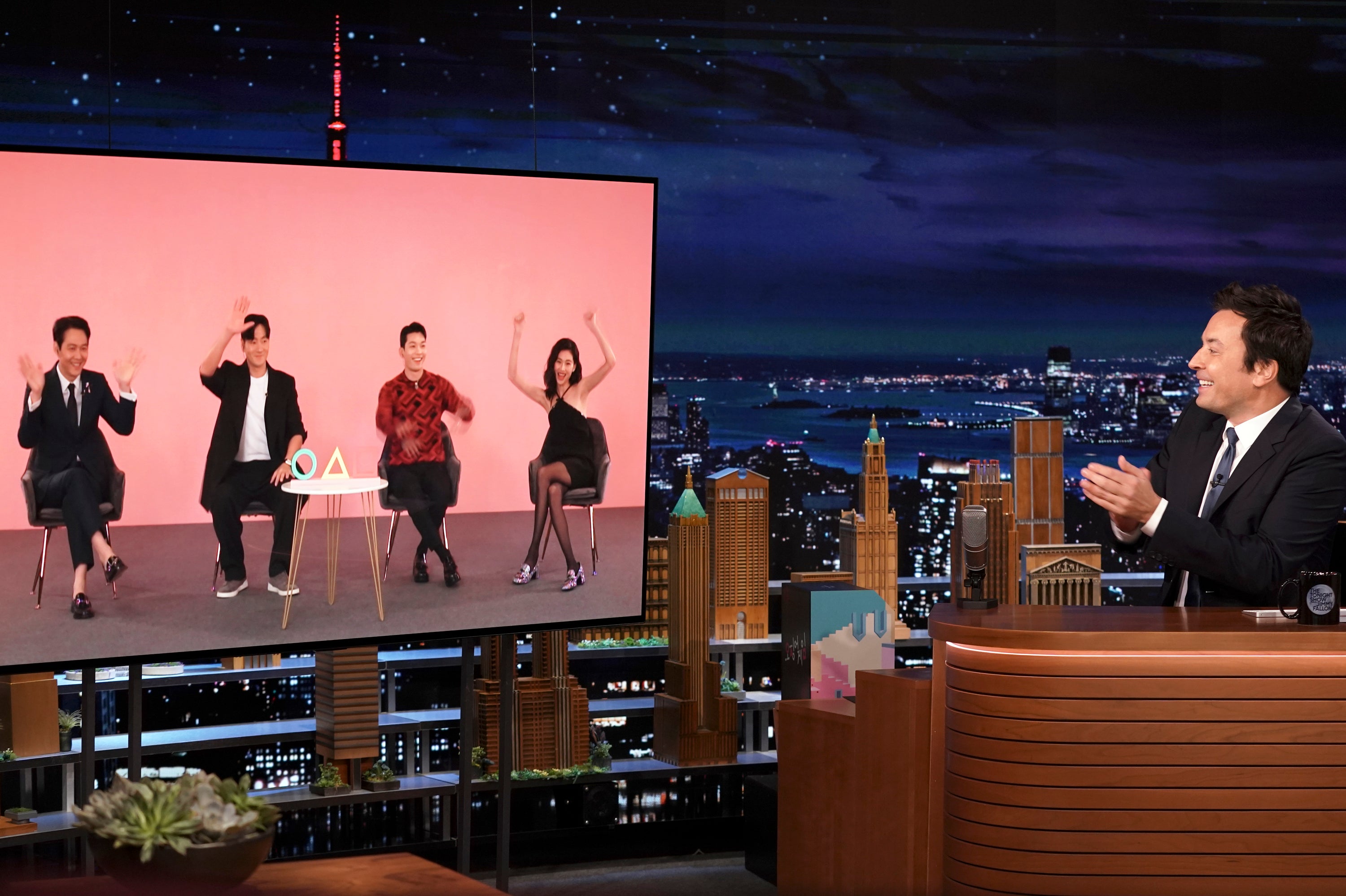 Die Schauspieler - darunter Lee Jung-jae, Park Hae-soo, Wi Ha-joon und Jung Ho-yeon - erschienen virtuell. Park, der Sang-woo spielt, sagte zu Fallon: "Ich bin so dankbar, dass so viele Leute dies über so viele Medien verfolgen, aber ich fühle es in diesem Moment noch mehr. Es ist real. Ich fühle es in meinen Knochen."