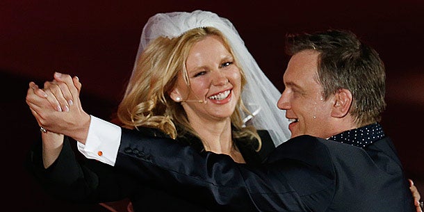 Bei einer früheren "Wetten, dass..?"-Sendung hatte Ferres vor laufenden Kameras scherzhaft dem Entertainer Hape Kerkeling einen Heiratsantrag gemacht. Der hatte abgelehnt. Jetzt tanzten Ferres und Kerkeling in Offenburg einen Hochzeitwalzer - dazu trug die Braut in spe einen weißen Schleier.