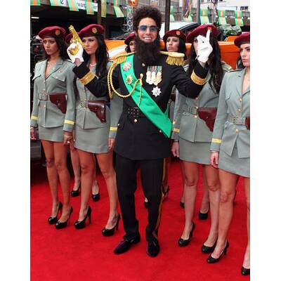 Er liebt den großen Auftritt, und bei der Weltpremiere seines neuen Films "Der Diktator" drehte Komiker Sacha Baron Cohen mächtig auf: Mit goldenem Jeep, falscher Waffe, Lamborghini voller "Harrods"-Tüten und knapp bekleideten Models in Uniform fuhr der 40-Jährige am Donnerstagabend in London vor. Hunderte Fans, die auf ihn warteten, durften die Rolle des jubelnden und Fähnchen schwenkenden Volkes übernehmen.