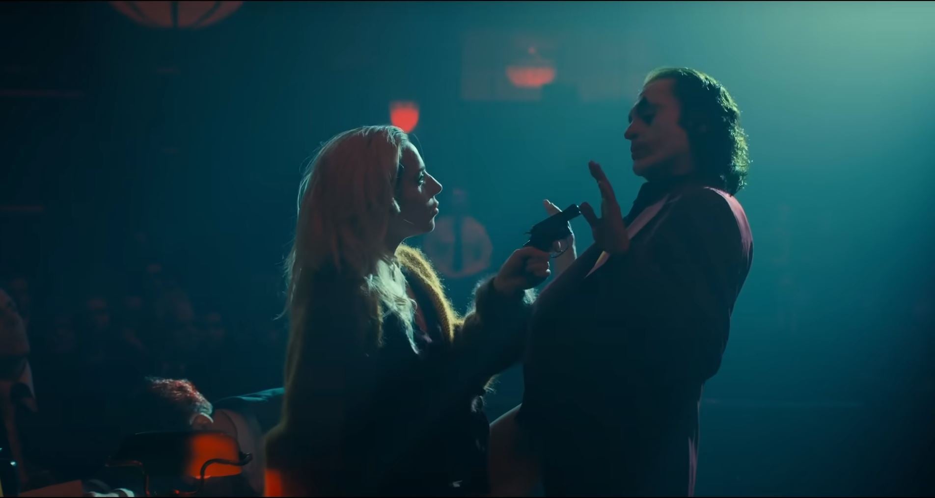 Der Trailer, der Fleck und Quinn auch beim Tanz auf einem Hotel-Rooftop, im Kino und mit innigen Kuss zeigt, wirft jedoch lediglich einen kurzen Blick auf Gaga im ikonischen Harley-Quinn-Outfit. Auch mit Narrenkostüm und dunklem Zirkus-Make-up. Dazu wird sie gezeigt wie sie sich vermeintlich mit den Fingern in den Kopf schießen will. Was eine Szene asu dem ersten Film widerspiegelt. Auch mit dem Satz „Ich bin niemand. Ich habe mit meinem Leben nichts gemacht wie Sie“, liefert sie eine Anspielung auf die Massenunruhen und gewalttätigen Morde, die Arthur im ersten verursacht hat.