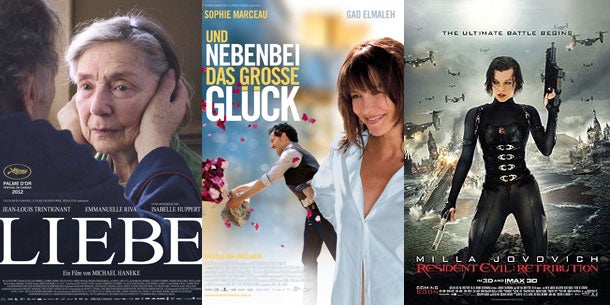Jetzt ist es definitiv soweit: Der Herbst ist in Österreich angekommen und somit fängt auch die Kino-Hochsaison wieder an. Nachdem nun die Temperaturen gerade dabei sind in den Keller zu rasseln, kommen da herzerwärmende Filme gerade Recht. Mit Michael Hanekes Meisterwerk "Liebe" wird einem garantiert schnell warm ums Herz. Aber auch Sophie Marceau sorgt in "Und nebenbei das große Glück", dass sich ein wohlig warmes Gefühl einstellt und dabei der Humor nicht zu kurz kommt. Für diejenigen, die es gerne etwas spektakulärer und blutrünstiger haben, ist diese Woche auch etwas ganz Besonderes dabei. Denn Milla Jovovich versucht in "Resident Evil: Retribution" erneut die Welt vor bösartigen Zombies zu retten. Hier nun die Filmstarts im Überblick.