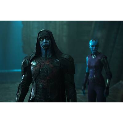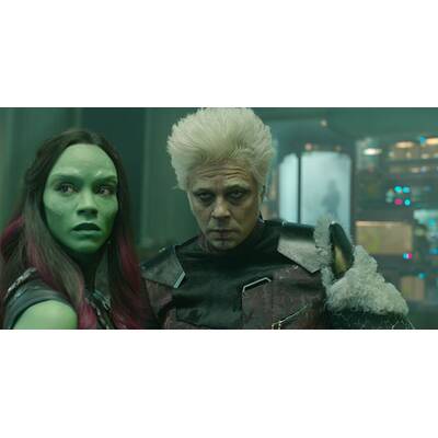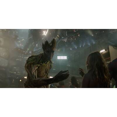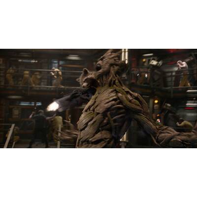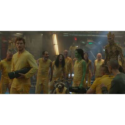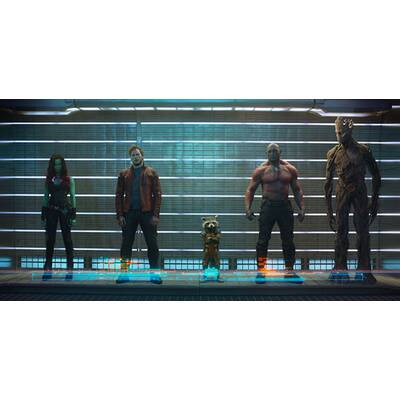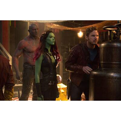 Davon noch nichts ahnend, führt der Zufall Peter im Weltraumgefängnis mit der übergelaufenen Adoptivtochter Thanos' - der kampflustigen und grünhäutigen Gamora ("Avatar"-Schönheit Zoe Saldana) -, dem rachelustigen "Zerstörer" Drax (Ex-Wrestling-Champion Dave Bautista), dem durch Experimente zum Super-Waschbär mutierten Rocket (Fahri Yardim; im Original gesprochen von Bradley Cooper) und dessen wortkarger Riesenbaumwurzel Groot (im Original: Vin Diesel) zusammen. Nach dem gemeinsamen Gefängnisausbruch wollen die schrägen Vögel die Kugel teuer am Schwarzmarkt verscherbeln. Von The Collector (Benicio del Toro) über deren fatale Wirkung aufgeklärt und von Ronan kurz darauf beraubt, raufen sie sich schließlich zusammen, um todesmutig die Galaxie zu retten.