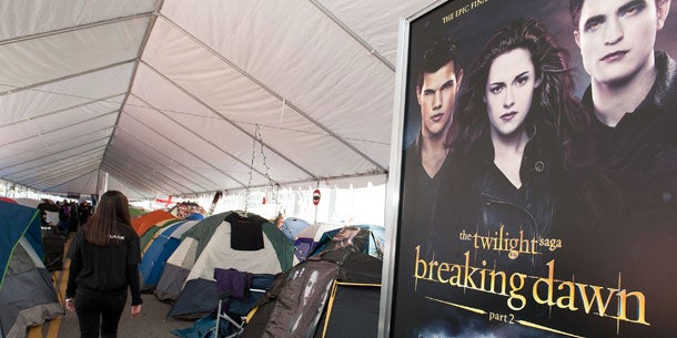Mehr als 2000 eingefleischte Fans campierten am Wochenende vor dem Nokia Theatre in Los Angeles. Das haben die PR-Bosse hinter der Vampirsaga geschickt eingefädelt. Waren es im letzten Jahr "nur" knapp über tausend Camper, so lässt das Studio Summit Entertainment beim großen Finale fast doppelt so viele Fans in der werbewirksamen Zeltstadt zu. Zum Zeitvertreib gibt's "Twilight"-Filme, Sportübungen und "Überraschungsgäste".